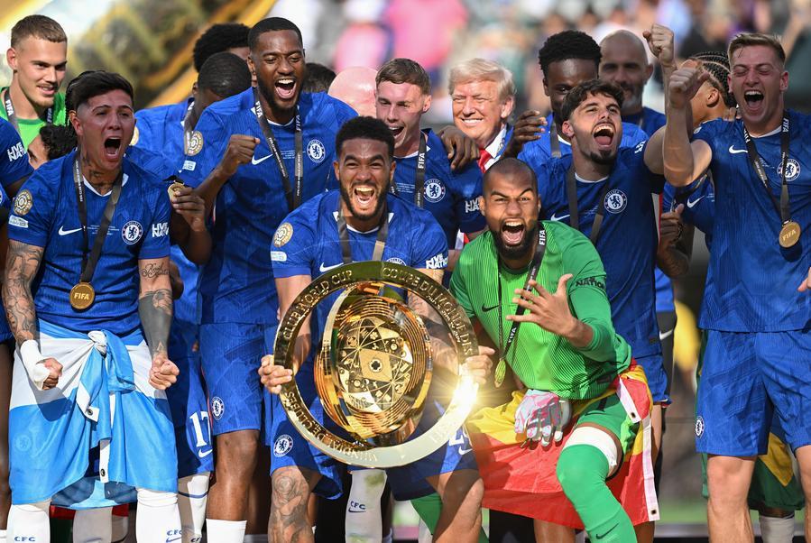 في الصورة الملتقطة يوم 13 يوليو 2025، الرئيس الأمريكي دونالد ترامب (في الخلف) يحتفل مع أعضاء فريق تشيلسي الإنجليزي الفائز خلال حفل توزيع الجوائز للمباراة النهائية بين تشيلسي (إنجلترا) وباريس سان جيرمان (فرنسا) ضمن بطولة كأس العالم للأندية 2025 على ملعب ميتلايف في ولاية نيو جيرسي بالولايات المتحدة. (صورة أرشيفية، شينخوا)