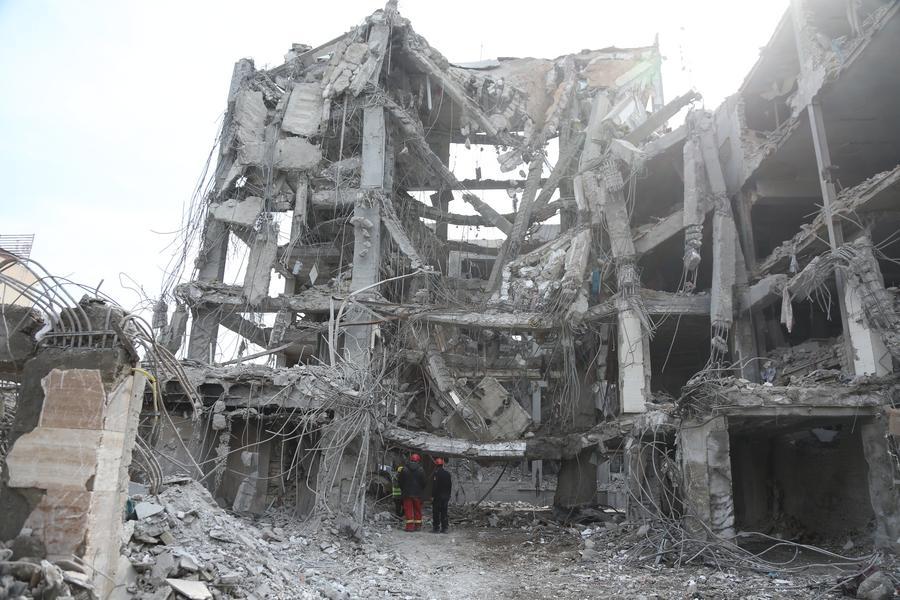 في الصورة الملتقطة يوم 12 مارس 2026، أناس يباشرون عملهم أمام مباني متضررة جراء غارات جوية إسرائيلية على العاصمة الإيرانية طهران. (شينخوا)
